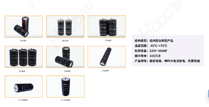 合众汇能推出的低内阻功率型超级电容产品,额定电压从2.7V~3.0V,容量从240F到4200F,该产品具有超低电阻、瞬时大电流放电、功率输出能力强,抗震性强;长使用寿命,免维护,绿色环保等特点;