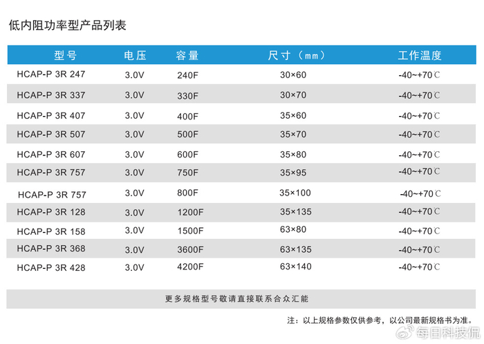主要应用领域有医疗设备、电网调频、汽车应急启动、航天航空、通信系统、无线电通信及相关大功率短时功能应用等。具体的参数详情请见下表: