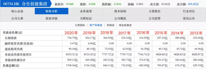 再到2020年,也就是合生创展正式布局资本市场之年,其负债总额增至1708.56亿元,同比增长48%。