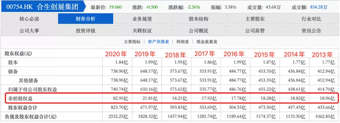 但到2020年,合生创展集团的少数股东权益开始大幅增长,达到82.95亿元,同比增长280%。