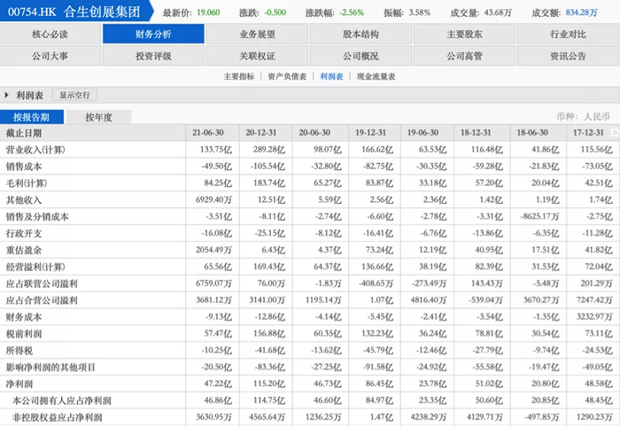 根据其2020年年报数据,朱桔榕上任当年,其投资收入从2019年的不计入财报,直接增至67.58亿元(按最新汇率计算),占全年营收的23%,也正是在这时候,合生毛利和净利率水平开始快速增长。