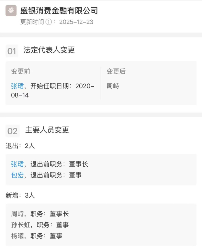 金融虎讯 12月24日消息,日前,盛银消费金融有限公司人员变动。在2025年12月23日的更新中,公司出现了法定代表人变更以及主要人员的调整。