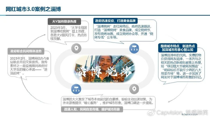 - 把握城市特点与当下社会背景、社会心理以及消费趋势的交集:淄博烧烤的火热背后能够看出,在经济环境整体下行的当下,地方对于街边摊贩的开明态度、当地商家的物美价廉,踩中了大众对地方保护就业岗位的赞许,以及追求性价比的消费心理。藏族少年丁真的走红也正是契合了女性网民审美从奶油小生到野性粗粝的转变。城市营销的传播要素不仅要考虑内部的资源供给情况,也要从C端出发,打造符合C端消费心理和趋势的产品。