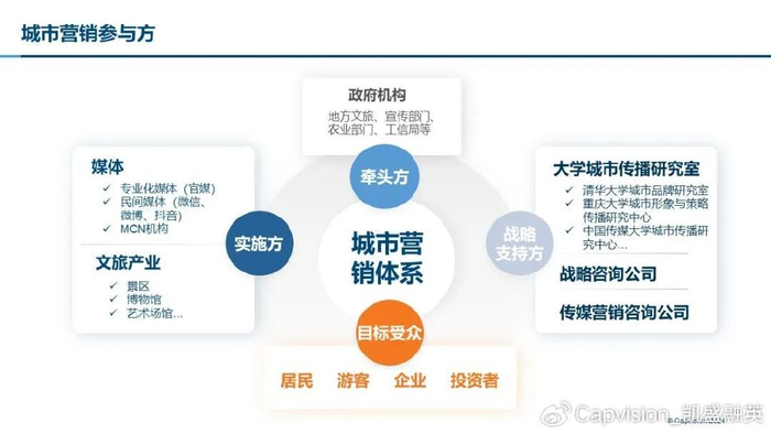 - 实施方:城市营销重要的参与方就是媒体,这其中包括媒体,比如传统的官媒,以及民间媒体(以两微一抖为代表)和一些服务于文旅营销的MCN机构、博主等。