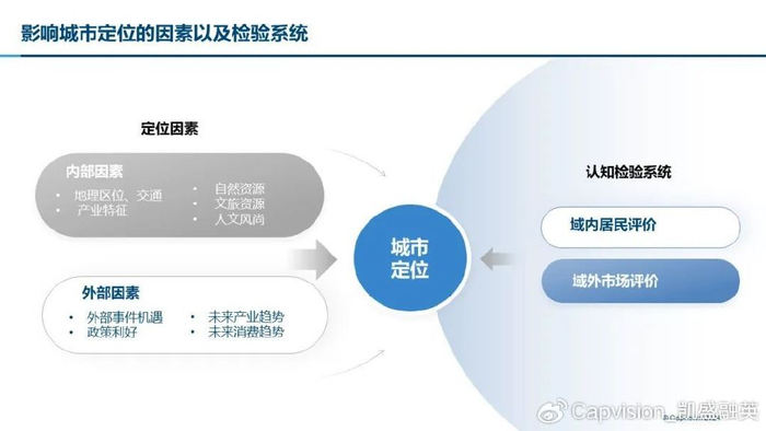 本文主要讨论的是以游客为沟通对象,以城市本身为营销主体的定位实践案例。在明确了营销主体后的下一个问题即是,如何为一座城市寻找定位?定位主要考量的因素包括内部因素和外部因素,内部因素包括城市的地理区位、产业特征、自然资源、文旅资源、人文环境等,而外部因素则包括一些重大的事件机遇、政策利好以及未来产业和消费趋势。为城市寻找到一个定位后,还需要进行认知检验,即这一定位是否与当地居民对于这座城市的认知一致,以及对于域外的游客或投资者来说,这一定位是否有与其认知有矛盾的地方,通过两个评价系统对定位假设的可落地性进行验证。
