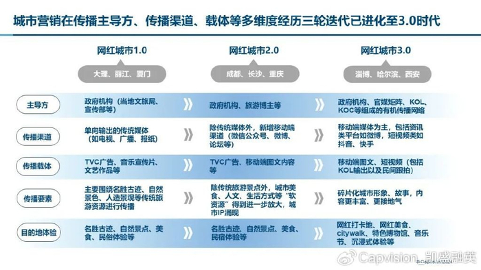1.0、2.0、以及3.0时代的网红城市营销在话语权方、传播渠道、载体以及传播内容等层面总结盘点如下: