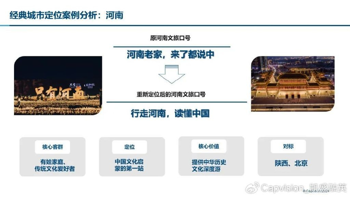 以河南文旅定位的案例为例:河南文旅较早打出的口号是“河南老家,来了都说中”,尽管这一句口号充满河南地方方言特色,体现了河南人的性情,但在文旅市场中竞争力较弱,并没有明确传达出河南对标谁、谁可以来河南玩以及河南的核心优势是什么。2021年河南卫视与优酷联合制作的综艺节目《唐宫夜宴》大火,河南具有深厚历史底蕴的这张牌被挖掘出来,之后河南卫视又制作了一系列综艺节目,中秋奇妙游、端午奇妙游等,将河南的历史文化,让消费者可体验、可感知。