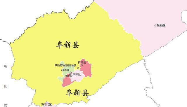 阜新县的地图很独特,从行政地图上可以看出,阜新县已经包围了阜新市区,阜新县与内蒙古、辽宁省锦州市、朝阳市接壤,阜新县已包围了阜新市西河区、海州区、太平区和新邱区,所有阜新市区都要经过阜新县,才能去其他地方。