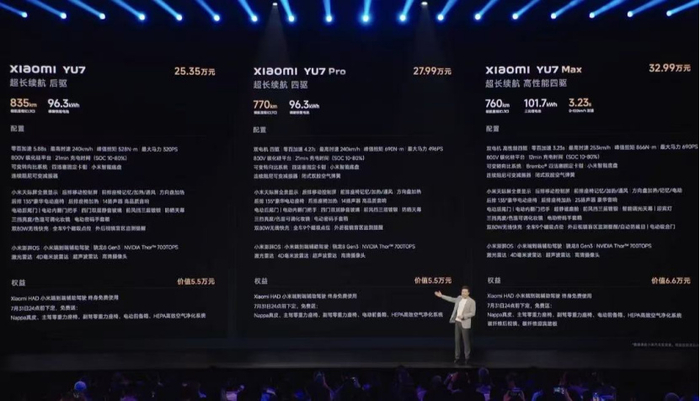 除标准版之外,小米YU7还有Pro版(起售价27.99万元)和Max版(起售价32.99万元)。