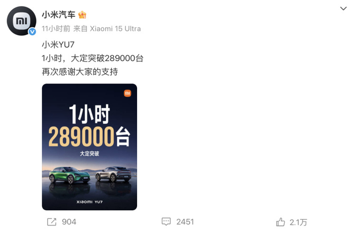 小米YU7昨晚发布后的媒体采访间内,雷军刚刚进场没说两分钟,就被工作人员递上的一个手机打断,上面是小米汽车官方统计的实时战报:当晚10点开售后,3分钟内小米YU7大定破20万台,开售1小时后大定突破了289000台。