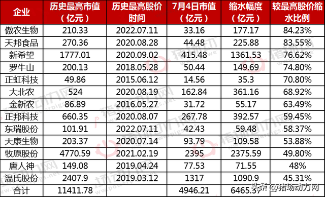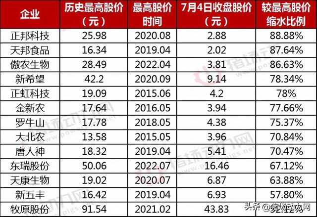 “2020年9月2日,新希望创1777.01亿市值,目前仅为415.48亿,市值缩水1361.53亿,缩水幅度76.62%;陷入重整旋涡的傲农生物2022年7月11日创造了210.33亿元的最高市值,目前市值仅为33.16亿元,缩水177.17亿元,缩水幅度达到84.23%……”