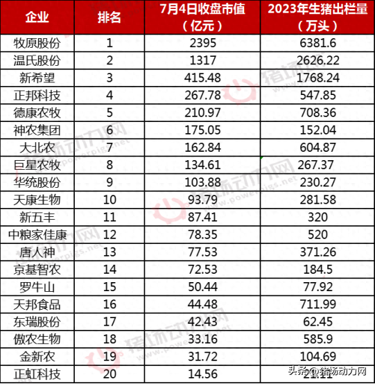 截至7月4日收盘,20家生猪养殖上市猪企,总市值合计达5809.01亿元,具体排名如下。