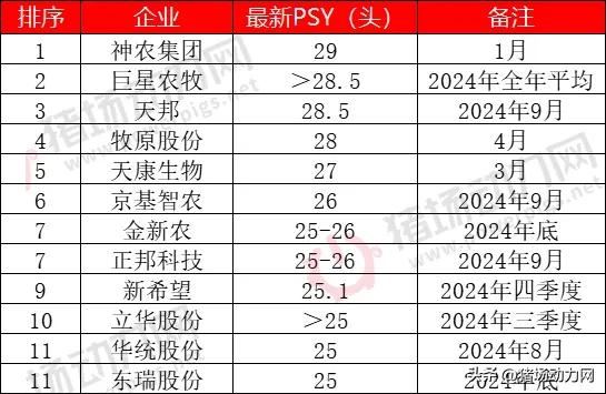 前5名的PSY都已接近30头。其中,神农集团透露1月PSY为29头;牧原股份虽表示近期PSY在28左右,但2024年12月曾超过29;巨星农牧2024年全年平均PSY超过28.5头,其中,在2024年二季度已达到29以上;天康生物则在3月表示,目前整体PSY已达27,部分优秀厂区更是超过30。