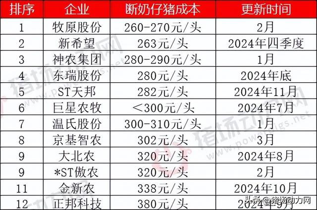 其中,牧原股份、新希望以260-270元/头的成绩领先。
