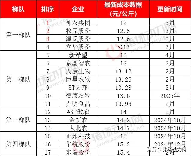 神农集团、牧原股份、温氏股份成为最新成本榜TOP3,分别为12元/公斤、12.5元/公斤、12.6元/公斤。其中,成本第一的神农集团,也同时摘下了PSY和料肉比的第一名——可见养殖成绩的提升对于降本的重要性!