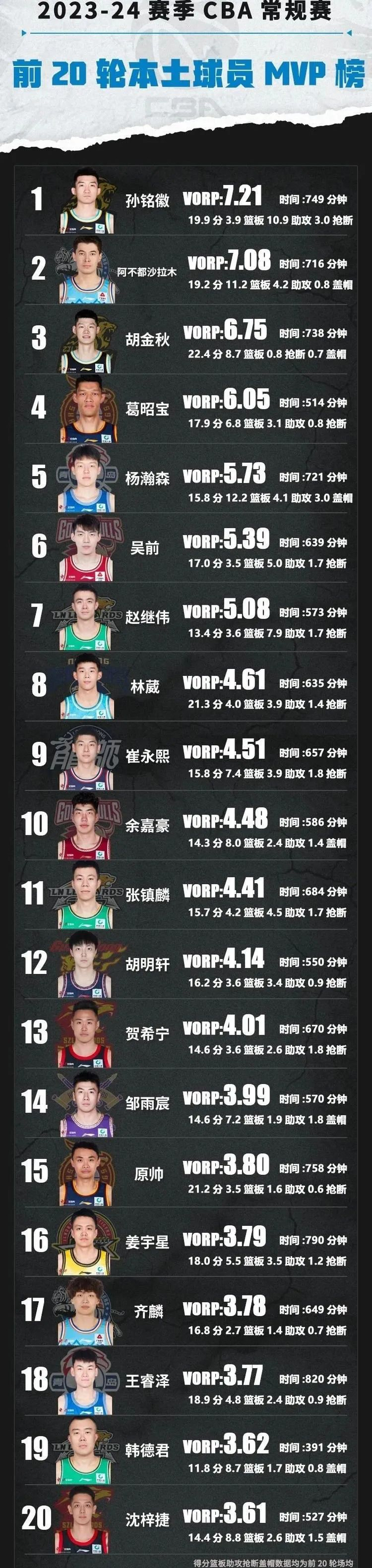 首先这份榜单是由孙铭徽领衔,榜单前三分别是孙铭徽、阿不都沙拉木以及胡金秋。孙铭徽在CBA这个阶段表现非常亮眼,场均能贡献两双数据。场均近20分的得分表现,包括10.9次助攻,此外还有3.9个篮板3.0次抢断,可以说是联赛第一后卫当之无愧。不过27岁的孙铭徽年龄不小了,目前NBA的球探对他并不感兴趣。而且孙铭徽也需要在CBA联赛拿到冠军来证明自己。
