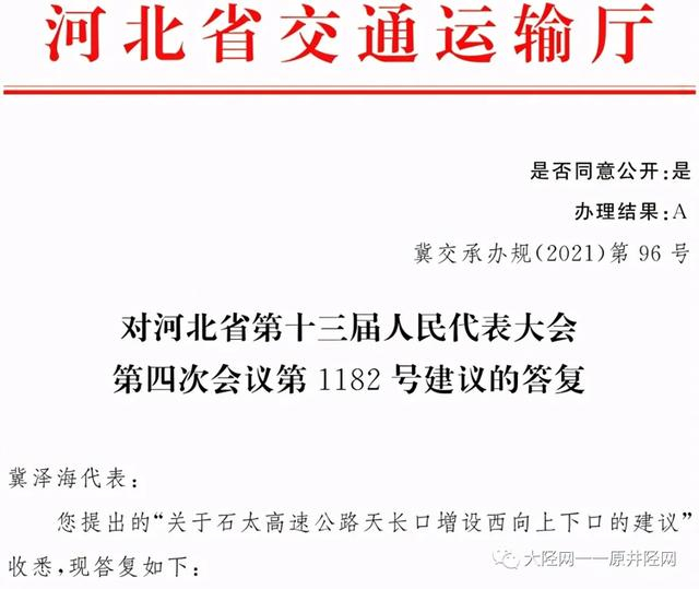 日前,河北省交通运输厅网站发布《对河北省第十三届人民代表大会第四次会议第1182号建设的答复》,针对代表提出的“在石太高速公路天长口增设西向上下口”的建议,省交通运输厅在答复中表示,目前石太高速的改扩建工作正在全力推进,天长高速出入口拟改建为双向互通,将在该高速的改扩建中一并实施。