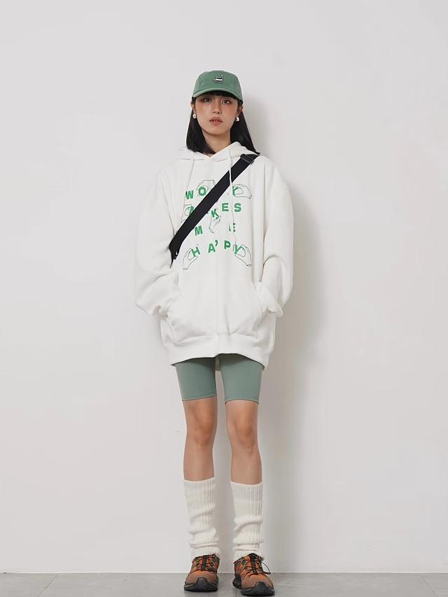 穿瑜伽裤+萨洛蒙运动鞋,最担心的问题就是瑜伽裤勒出女性“尴尬区”,因此,搭配卫衣时,尽量选择偏长一点的遮胯版型,可以起到很好的遮掩效果。同时,上半身也可以采用“内长外短”的叠穿法,利用内搭衣长来掩饰“尴尬区”,既得体又显瘦。