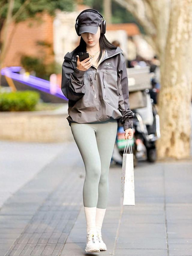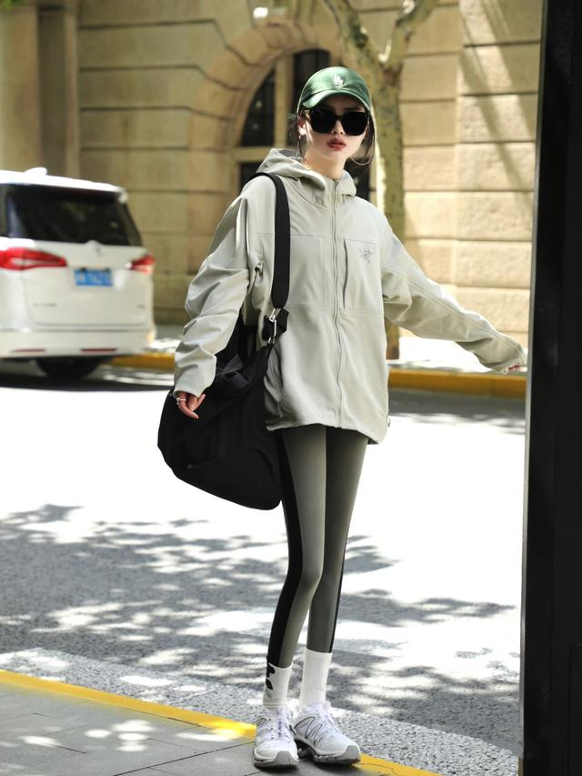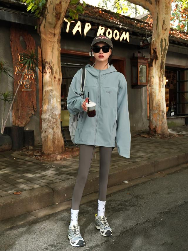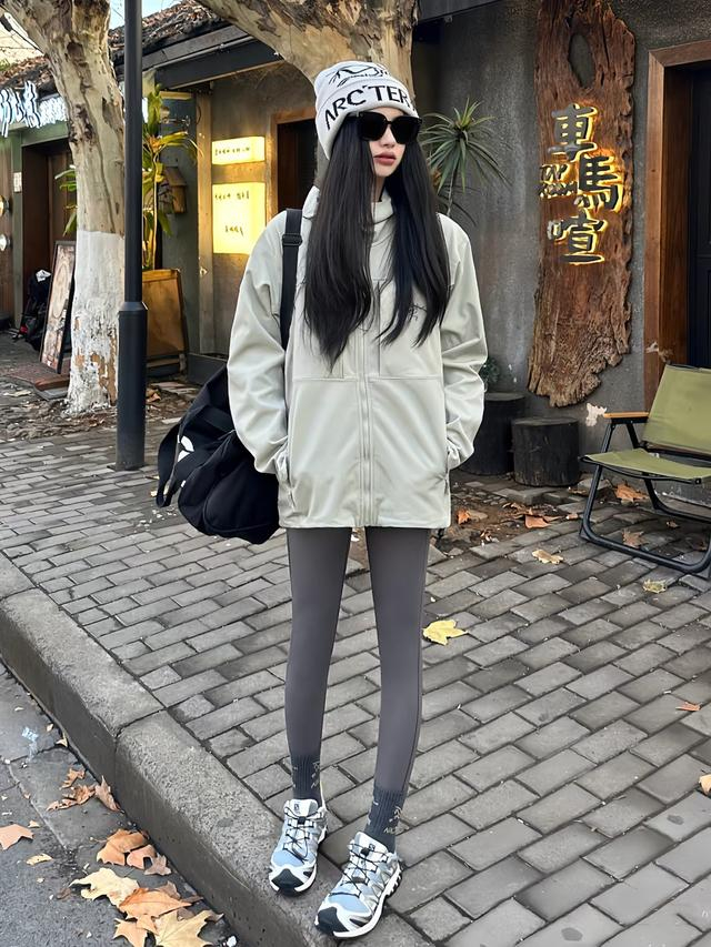 穿“瑜伽裤+萨洛蒙运动鞋”搭配冲锋衣时,是近年来非常流行的一种穿法。选择冲锋衣时,以合身偏宽松的版型为主,避免紧身带来的紧绷感,也要规避松垮给人的邋遢感,合身的冲锋衣搭配瑜伽裤和运动鞋,平衡视觉,中和风格,更有助于修饰身材。
