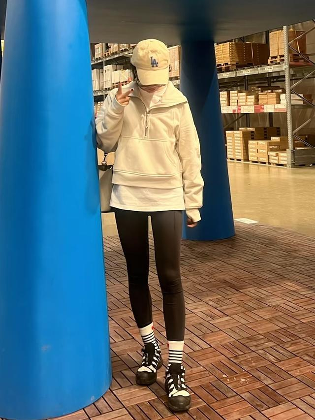 比如,瑜伽裤与棒球帽颜色一致,卫衣与袜套统一为白色,脚踩撞色系的萨洛蒙运动鞋,全身配色简约干净又深浅分明,整体层次感更丰富。