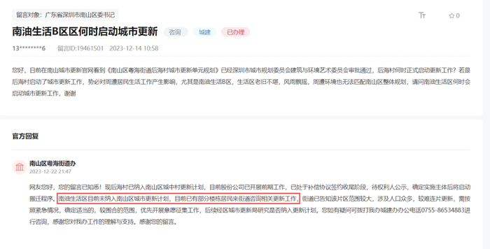 据南山粤海街道办去年8月最新的回复,明确表达: