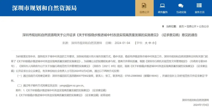 1月4日,深圳拟发布城中村旧改新规,《关于积极稳步推进城中村改造实现高质量发展的实施意见》征集稿(下称“征集意见稿”)发布,强调政府主导、分类实施。