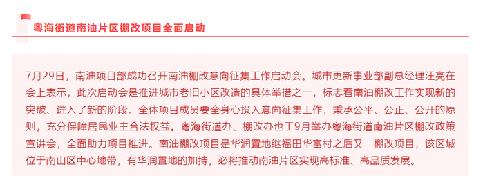 华润城更官方发文称“南油棚改项目是华润置地继福田华富村之后又一棚改项目”,正式宣布进驻南油棚改项目。