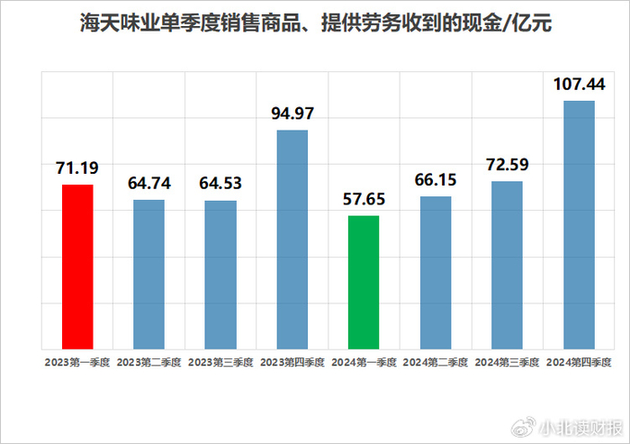2024年Q1海天味业的预收款项,低于往年同期;但是从Q2开始转好,并在Q4达到了最高值107.44亿元。