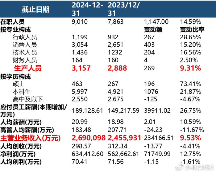 海天味业湖北武汉生产基地,于2024年2月开始营运,是公司在职人员同比增长14.59%,以及应付职工薪酬同比增长26.75%的主要原因。