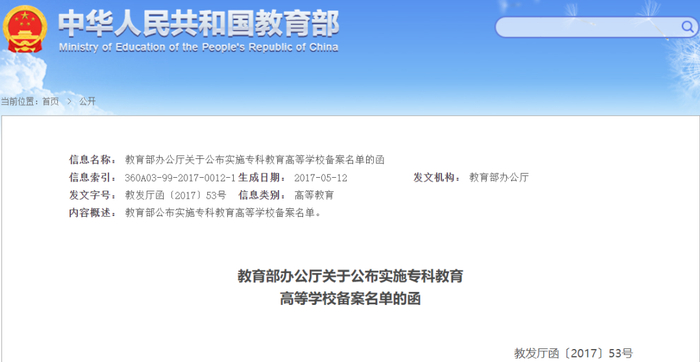 2020年5月12日,国家教育部办公厅下发《教育部办公厅关于公布实施专科教育高等学校备案名单的函》,对湖南九嶷职业技术学院“民办转公办”备案予以公布,湖南九嶷职业技术学院“民办转公办”顺利通过教育部审核备案。