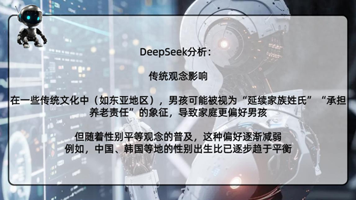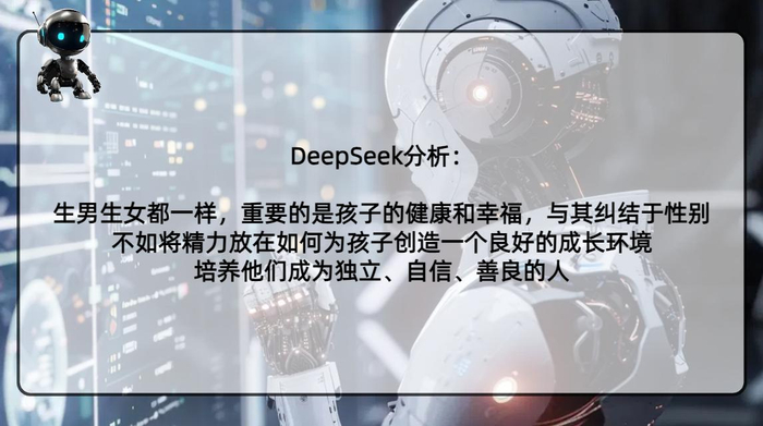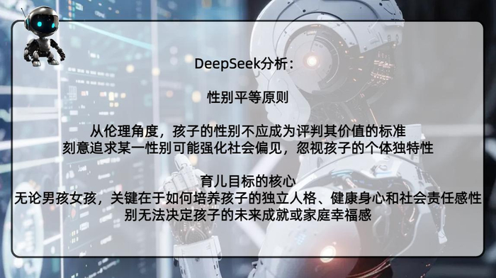 DeepSeek接着分析道:从伦理角度来看,孩子的性别不应该成为评判的标准,难道女孩就不可以被视为家族的延续吗?重男轻女是传统陋习,现代社会不应该接着延续这个陋习。