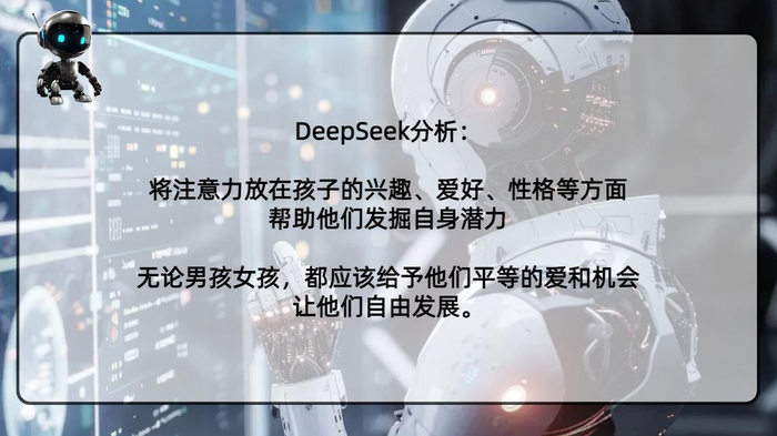 最后DeepSeek总结道:性别没有区分,男孩和女孩都是平等的,所以一定要打破重男轻女的思想,男人能做的,女人同样能做,毕竟有句老话说得好,”妇女能顶半边天“。