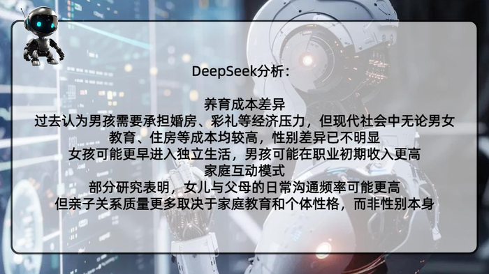 对此DeepSeek分析:如今生男孩的成本很高,根据数据显示,要抚养一个男孩长大成人最少要花几十万,在你将他抚养成人后,还要给他购置购买房子和车子,并且结婚还要帮付彩礼。