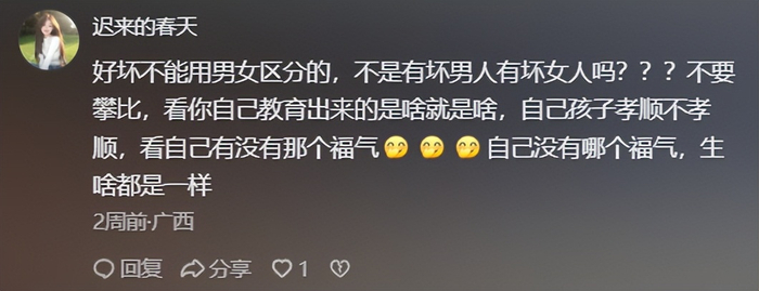 这位网友的表达就一针见血了,好坏不能用男女来区分,而是用行动来区分,有坏男人也有坏女人,无论是男孩还是女孩,三观都是教育出来的,所以在这位网友看来,生男生女都一样。