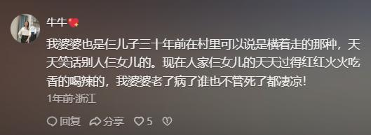 所以生儿子不见得比生女儿好,生再多儿子如果没有很好的教育那也是白搭,所以这是教育的问题,人家就是生女儿教育的好,所以老了以后能够享清福,三个女儿轮流管。