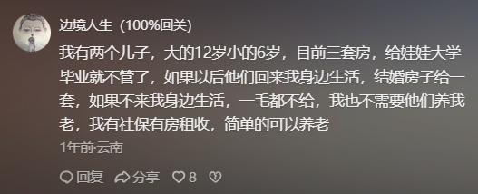 果然条件好才敢生儿子,毕竟现在生儿子的成本太高了,光买房买车就足以让很多人望而却步,但是你有句话说的不对,儿子要想出来外面生活那是他们的选择,不应该过多阻拦。