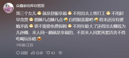 那对于这个问题,网友们都有着怎样的观点呢?这位网友的心态就很好,男孩女孩都一样,在生活方面,女儿更让人感到贴心,毕竟是“贴身小棉袄”,所以说生儿子有时候还不如生女儿呢。