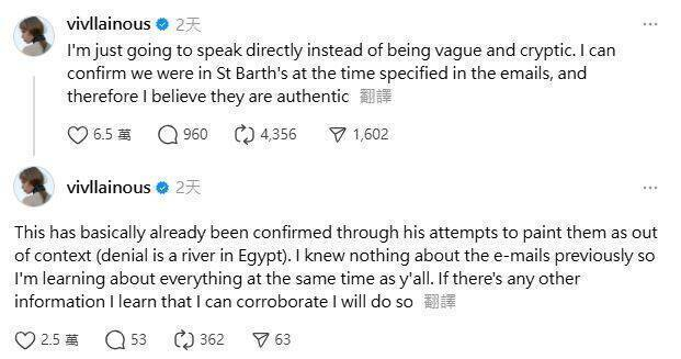 不过,现年21岁的薇薇安随后在Threads平台发文,公开与父亲说法相左。她表示,虽然自己也是通过此次文件披露才得知这些邮件的存在,但她清楚记得9岁那年(2013年),全家确实在邮件所提及的时间段前往加勒比海地区。她回忆称,自己对当年在当地乘船、望向“昏暗海面”的画面记忆犹新,认为这与司法部文件中呈现的时间线高度一致,并非所谓“恶意解读”。