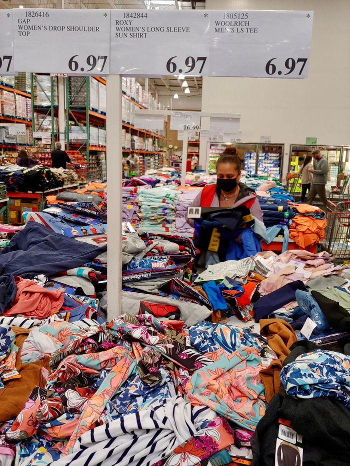 2025年4月美国物价。GAP女士落肩上衣、Roxy女士长袖防晒衫、Woolrich男士长袖T恤衫,每件6.97美元。