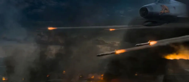 另一边,队长驾驶战机绕到火车前方,瞄准铁轨发射导弹。火车司机见状紧急刹车,但为时已晚,火车头冲出铁轨,引发一连串撞击。