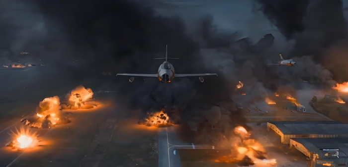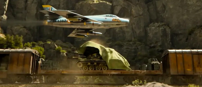 印军战机毫不迟疑,俯冲而下,距离火车仅几米时拉起,强大的气流掀开了火车上的帆布,隐藏的坦克和高射炮瞬间暴露无遗。