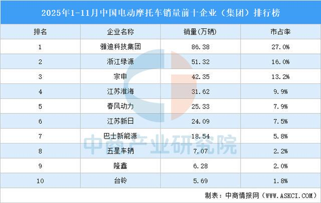 中商情报网讯:1-11月,全行业电动摩托车销量320.2万辆,同比增长0.02%。TOP3企业销量市占率合计56.2%,TOP5企业销量市占率合计74.0%,TOP10企业销量市占率合计93.3%。