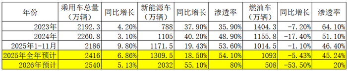 燃油车如此幅度的降价结果是什么?是否实现了以价换量,并阻止新能源车的增长势头呢?并没有,新能源车增长势头只是稍微慢了一些,依然在快速增长。根据中汽协数据,最近3年发展情况如表1所示,请注意我们先只谈国内乘用车市场情况,先不考虑汽车出口及国内商用车。下表我们也给出了2025年全年预计,以及按2026年国内乘用车总量增长5.1%,新能源乘用车国内渗透率达到80%的预测情况。2026年燃油乘用车销量将只有508万。