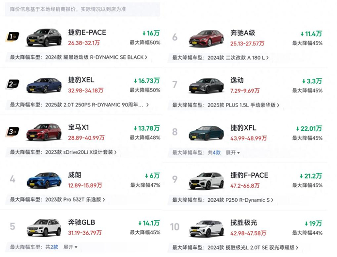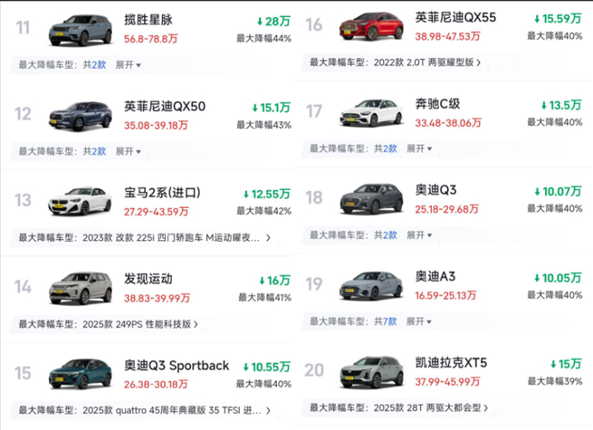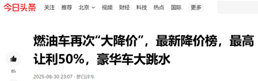 2023年,油电同价导致整个车市掀起了大规模的价格战。标志性事件的是2023年 3月,湖北政企联合补贴,雪铁龙C6最高降9万元,引发全国超40家车企、上百款车型跟进,合资燃油车终端优惠显著扩大,豪华品牌折扣率同步提升。直到2025年上半年,汽车行业空前的价格战促发燃油车空前惨烈的降价幅度,甚至大量之前的豪车降价幅度达到20%—50%。
