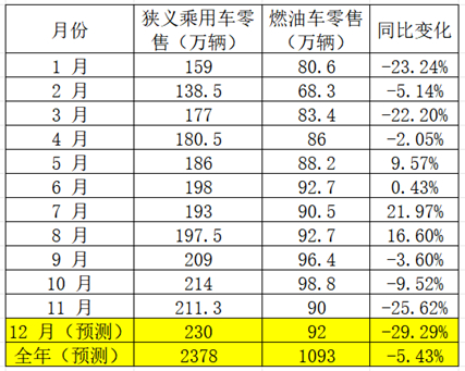 燃油乘用车同比跌幅已经从11月的25.62%迅速扩大到接近40%的程度,新能源车月度渗透率已经超过60%。表2中是业界对12月份和全年的预测。其中对燃油车的预测是极度乐观的。