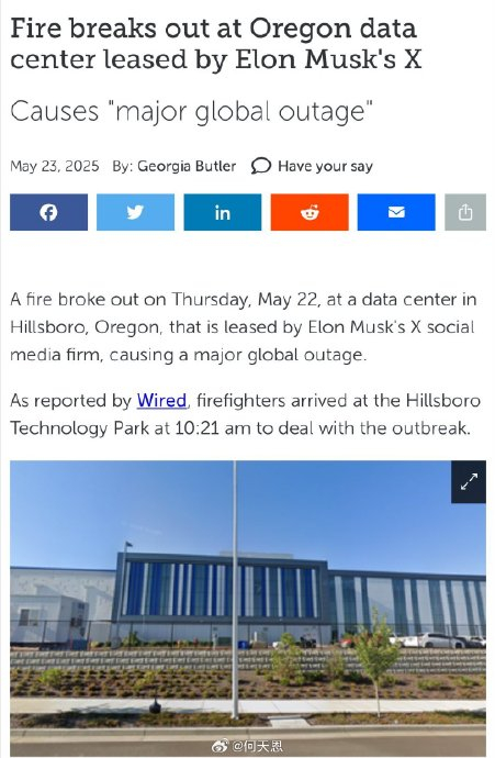 报道称,X数据中心着火了。