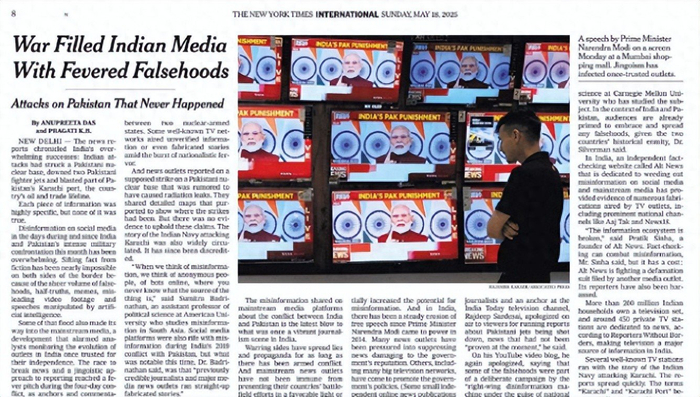 该报最近整版刊文揭露,印度在印巴冲突期间系统性编造虚假战果,从“摧毁巴基斯坦核基地”到“击落600架无人机”,所有“捷报”均被证实为彻头彻尾的谎言。