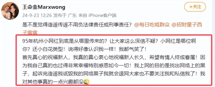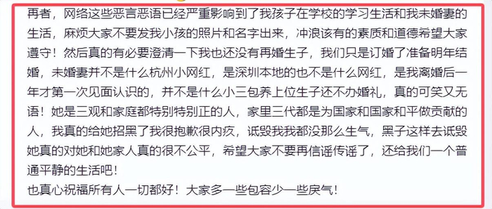 他表示自己目前并没有再婚生子,但是目前已经订婚,未婚妻也不是网红,不是小三包养上位,两人是离婚后一年第一次见面,一切都是循序渐进发生,现在网络上很多人造谣他婚内出轨现在的未婚妻,给他的生活带来了一定的困扰。