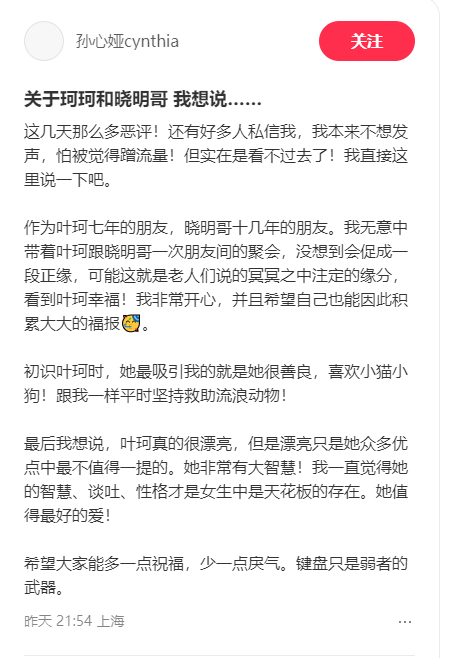 其实就在王命金发文前,叶珂的朋友孙心娅也发文,透露黄晓明和叶珂是自己牵线搭桥才认识的,当时她认识叶珂七年,和黄晓明也做了十几年的朋友,本以为只是一场简单的聚会,没想到促成了一段正缘。