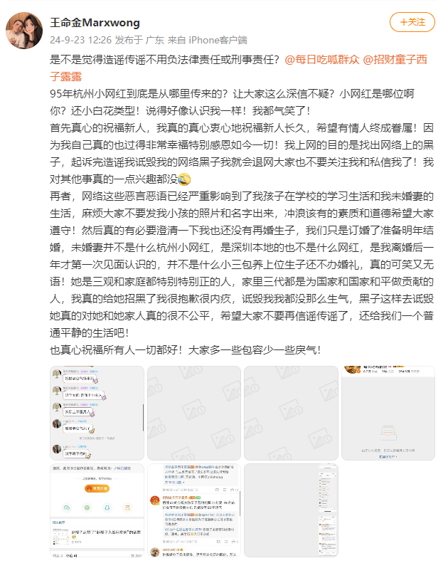 王命金称有一些人在造谣叶珂私生活的同时伤害到了他的孩子和未婚妻
